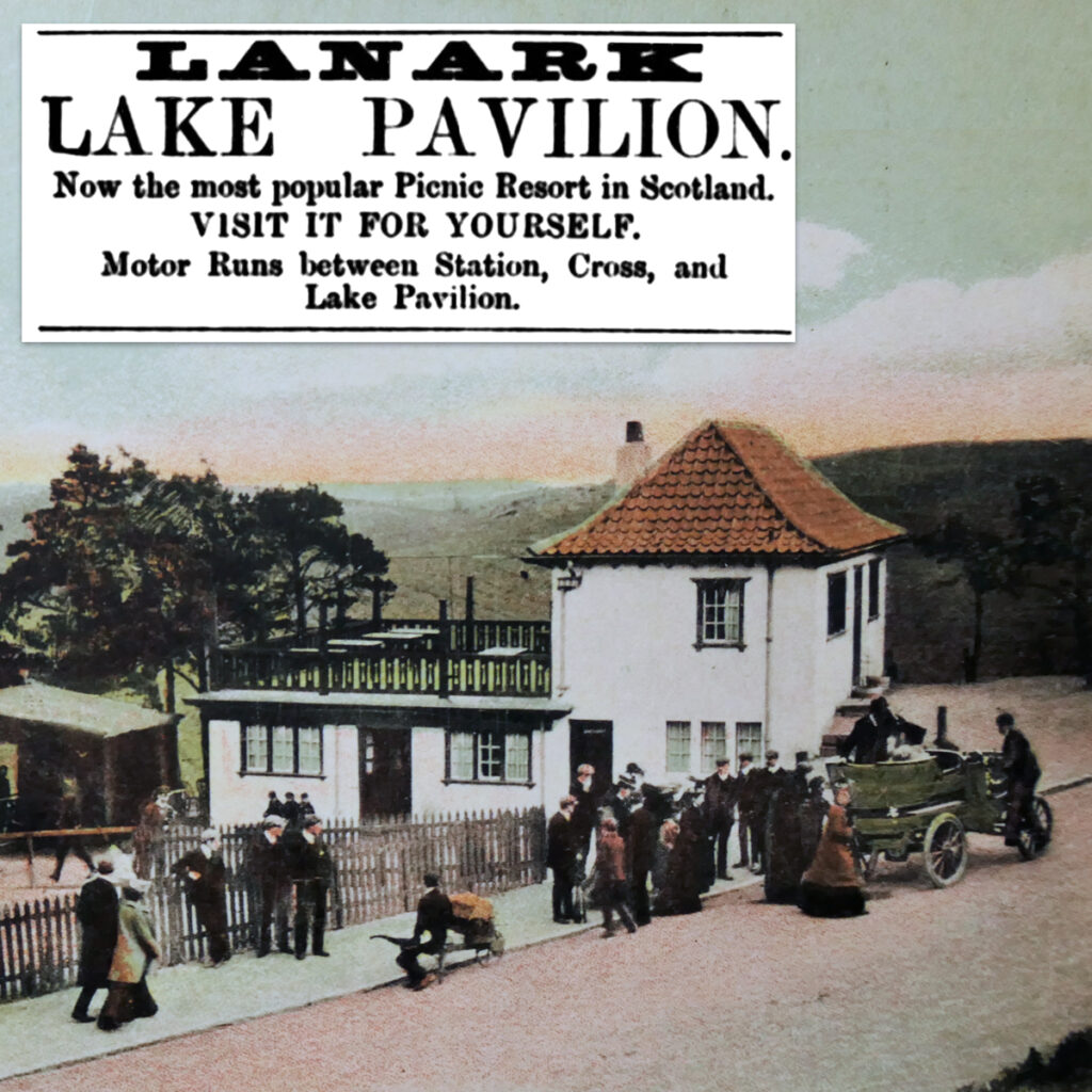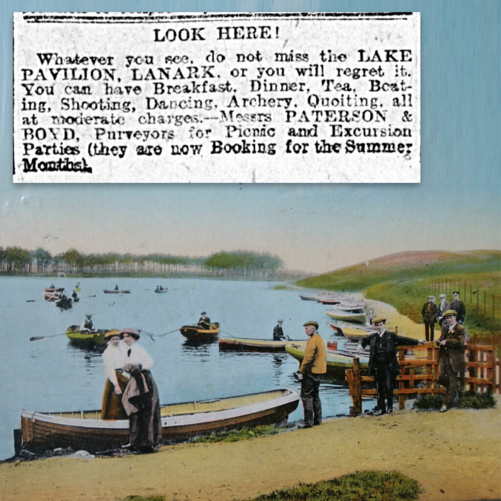 The Lake Pavilion and its leisure facilities were an immediate success and were soon a popular stop on the established excursions by horse-drawn brake from the railway station to Corra Linn, Bonnington Falls, Cartland Craigs, or other local beauty spots. The Lake also became a destination in its own right, welcoming groups who spent the whole day by the loch-side, continually entertained by concerts, music, and amusements. The firm of Paterson & Boyd, (who described themselves as “purveyors for picnic and excursion parties”), seem to have supported the marketing and organisation of group excursions. They made some bold claims in their advertisements, regularly billing the Lake Pavilion as “the most popular picnic resort in Scotland” and in one instance “the finest place in the world for a picnic”. Lanark loch was also described as “one of the finest freshwater lochs in Scotland”…….! Regardless of the merit of these claims, the pavilion became a very popular destination for group outings from workplaces, bible classes, friendly societies, football clubs, and many other kinds of organisation. At busy periods the Caledonian Railway would run special trains, with over a thousand tourists arriving at the station each day, The Lake Pavilion even had a motor car at its disposal to convey visitors between the station and the loch, which itself must have been a significant novelty at that time.
