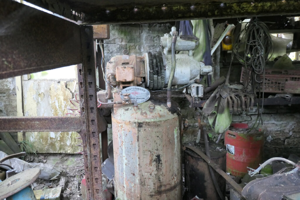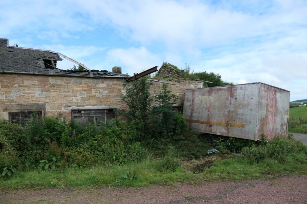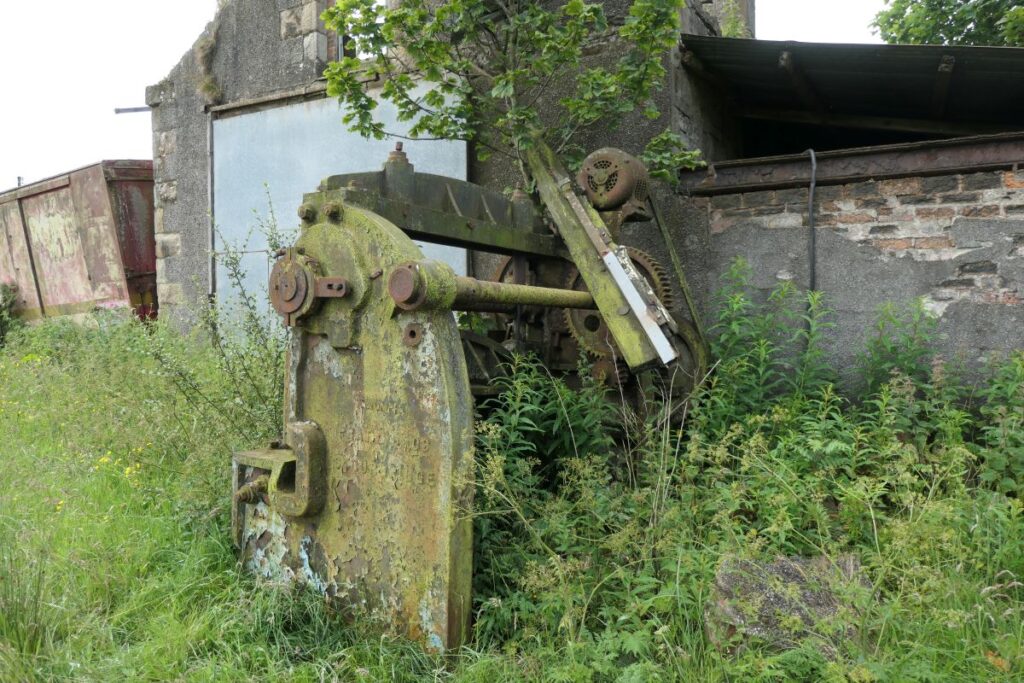 In a recent post we shared an image of local lads posing proudly with their stock-car outside the “garage” at Auchengray. Although the snap was taken not so long ago, the scene has sadly changed a great deal since then. The roof of the old building that was then used as a garage and workshop has now collapsed, and vegetation encroaches through broken windows. A heavy steel sheet guillotine still sits outside the building whilst peering through windows reveals other tools decaying inside.