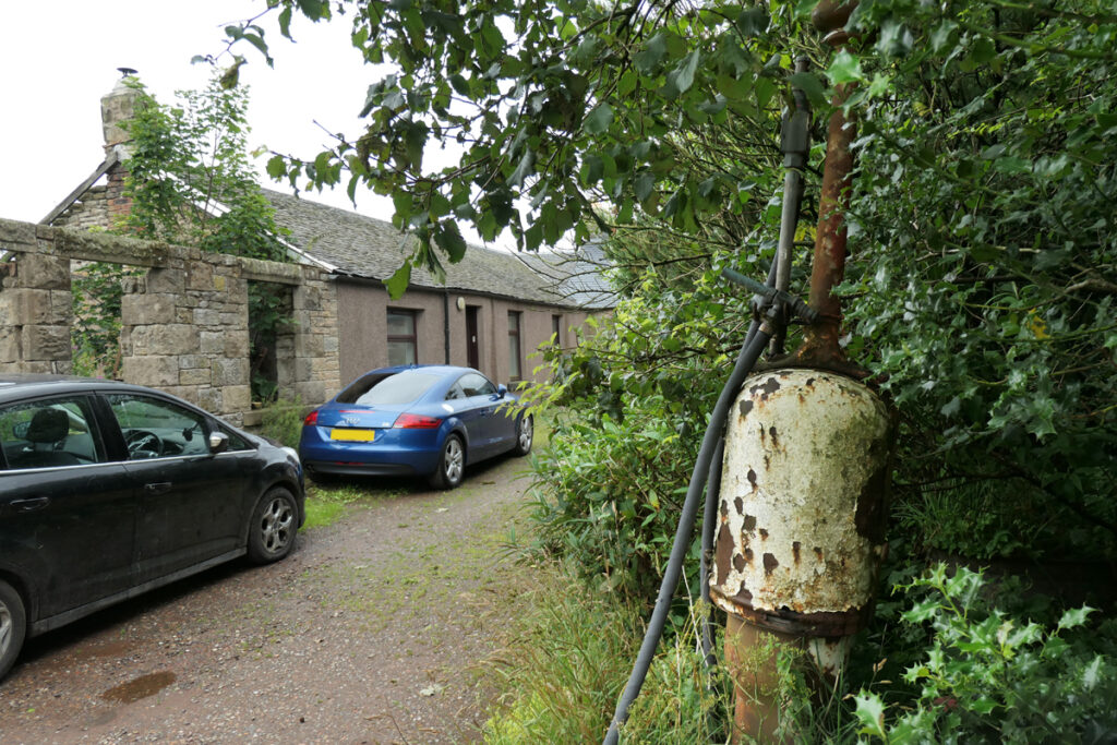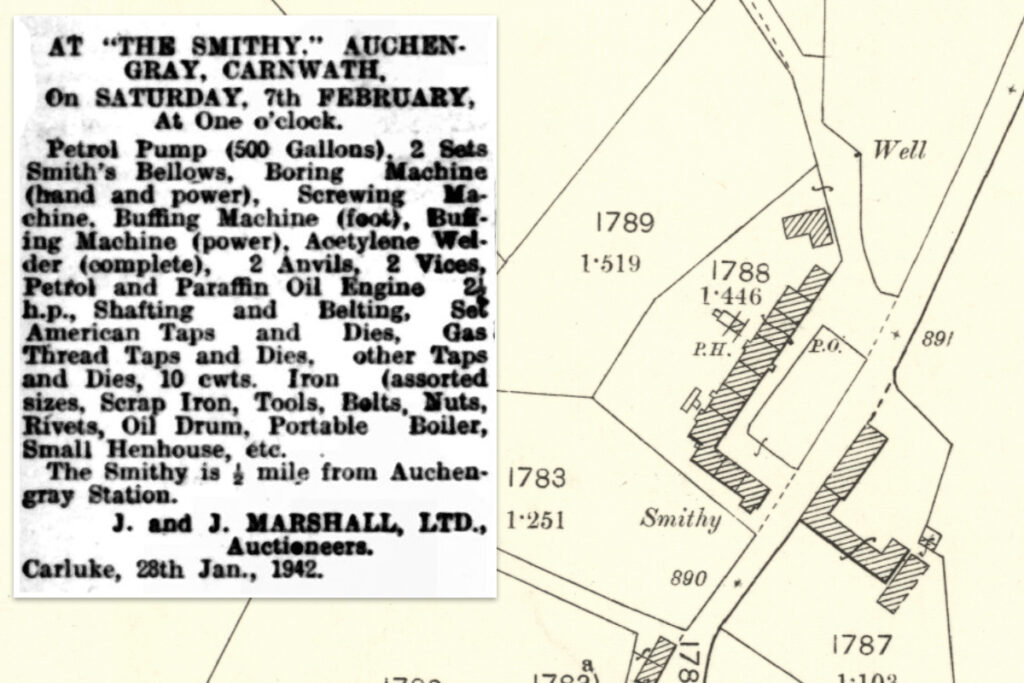 The derelict garage lies at the northern end of the row of ten or so houses that form the heart of the hamlet of Auchengray, and seems to have been built in about 1870, on the site of an earlier cluster of old thatched cottages. At the southern end of the row lay the Auchengray smithy, already in operation when the row was built.