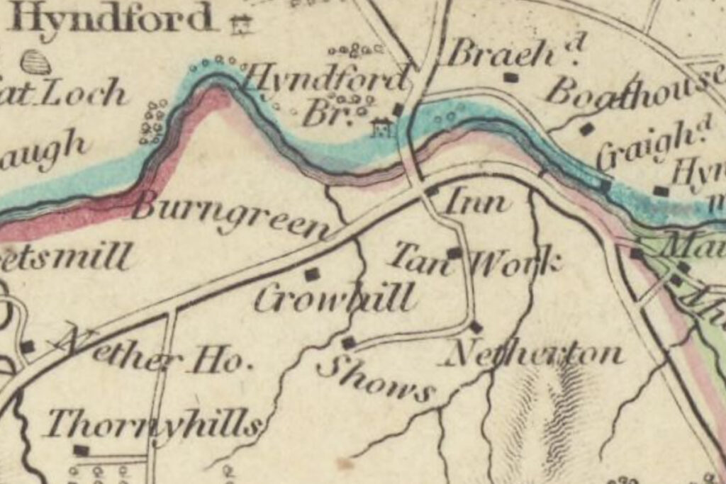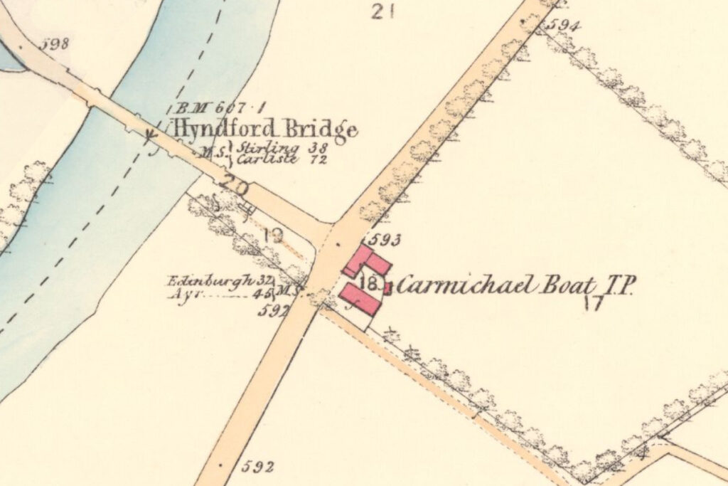 1.) This strip map was published just after Hyndford Bridge was constructed, and shows both the route of the bridge and the Carmichael Boat. 2.) Thomson’s map of 1822 shows an inn at the southern approach to Hyndford Bridge. 3.) 25″ OS map c.1860 shows the toll house – clearly titled “Carmichael Boat T.P.) along with two other buildings, perhaps associated with the former inn.