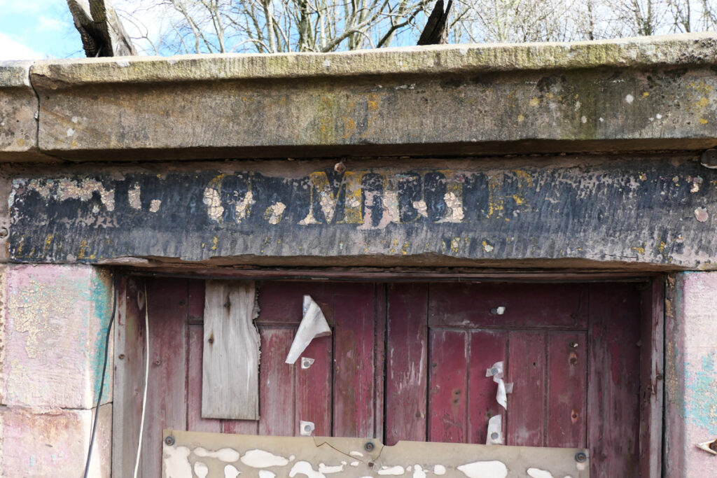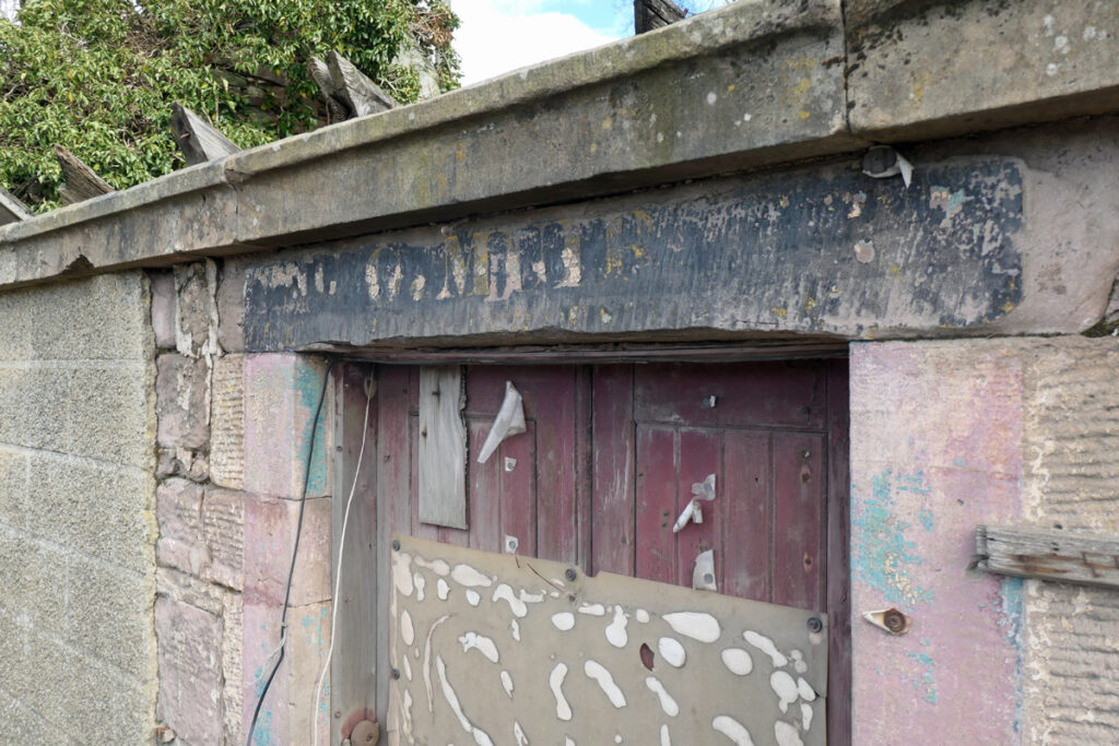 Ornamental signwriting has been revealed on the lintel over the front door, which had previously been covered by the timber porch. There seem to be several layers of lettering, the most prominent being bold letters in gold leaf that appear to spell out the name “G. Muir”, however we’ve failed to find references to anyone with that name associated with the building. Lower down on the lintel, and seemingly from an earlier period, are the remains of lettering in a cursive script of which only a few letters can be made out. Might this script date from the building’s time as a toll-house? We’ve found no old photographs that might help make sense of it.