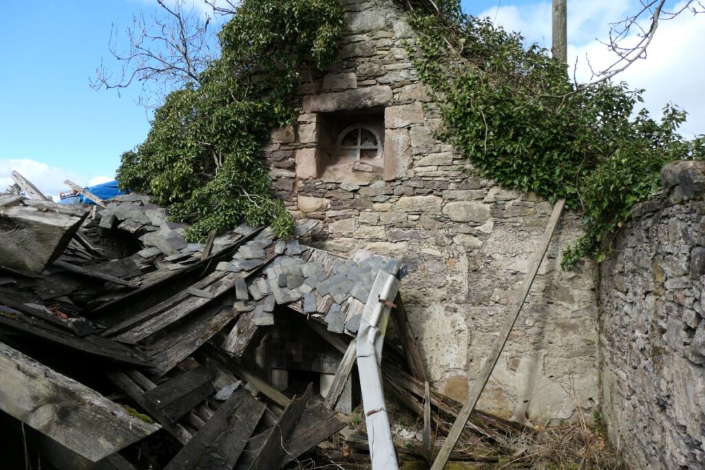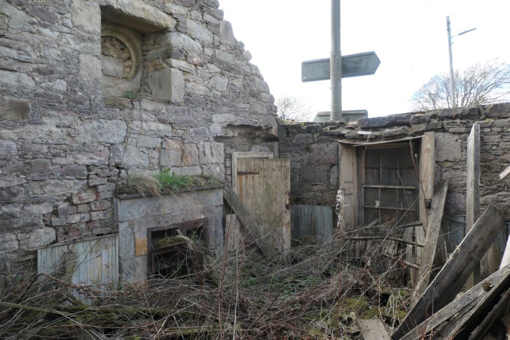 The old toll house is now in a sad condition; walls have crumbled, and surfaces flaked uncovering features that were previously hidden. It is now apparent that there were once tall windows on either end of the building that would have originally provided a view of traffic approaching in both directions. Unusual circular windows also once existed high on the gable walls.