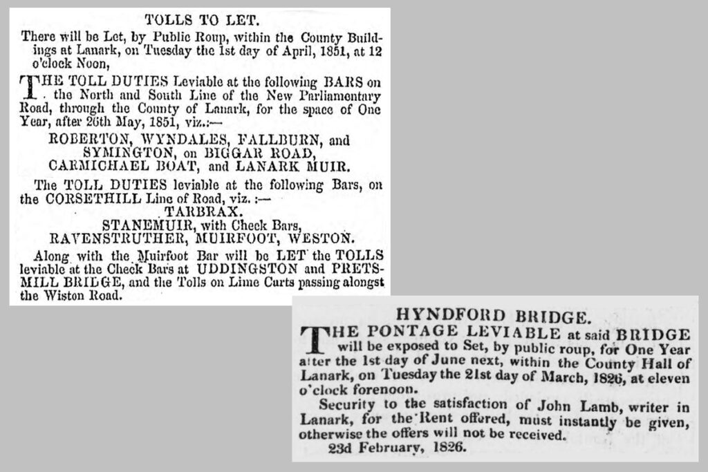 Map showing toll houses in the area – those in red still survive, and newspaper cuttings recording that tolls were let on an annual basis. The older notice suggests that pontage may have been charged separately from tolls at the time?