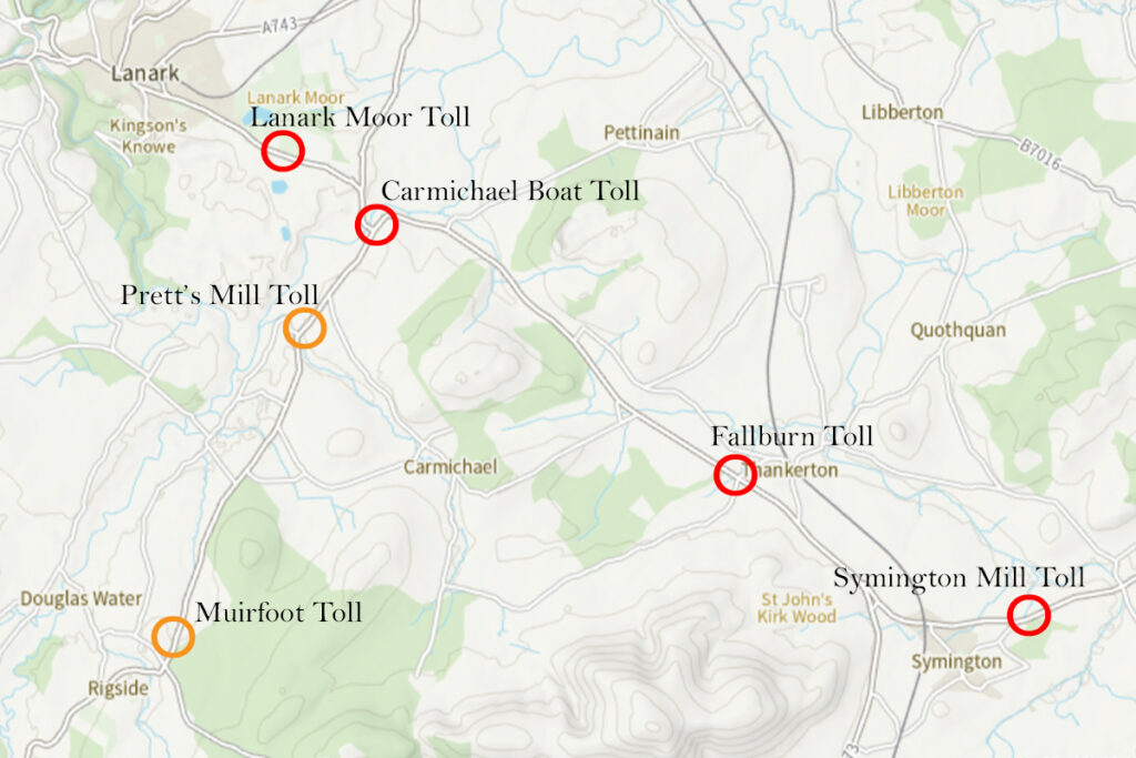 Toll roads were abolished in about 1884, when the County Council took over responsibility for maintaining roads. Most toll-houses owned by the Trustees of the North and South Lanarkshire Roads were sold off at that time, however those in Carmichael parish reverted back to the Carmichael estate. Thomas Inglis and his family were tenants of the former toll-house during the first two decades of the 20th century, and Robert Stewart during the 1930’s. Some may recall that later the porch of the toll-house served as a little shop, where cyclists, fishermen, or any other passers-by could stock up with sweeties and juice.
