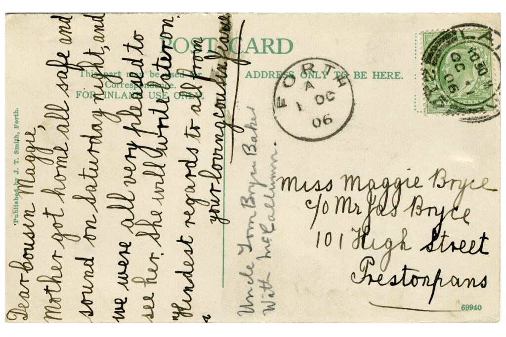 Coloured printed postcard, published by J.T. Smith, Forth, postmarked 1906. CR250034
